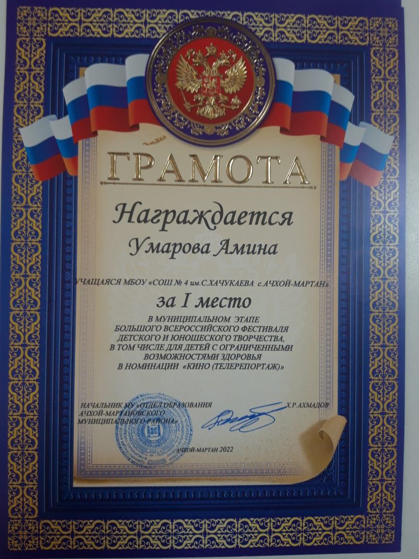 Учащаяся 11 класса Умарова Амина заняла 1-место в муниципальном этапе Большого Всероссийского фестиваля детского и юношеского творчества, в номинации "Кино (Телерепортаж).