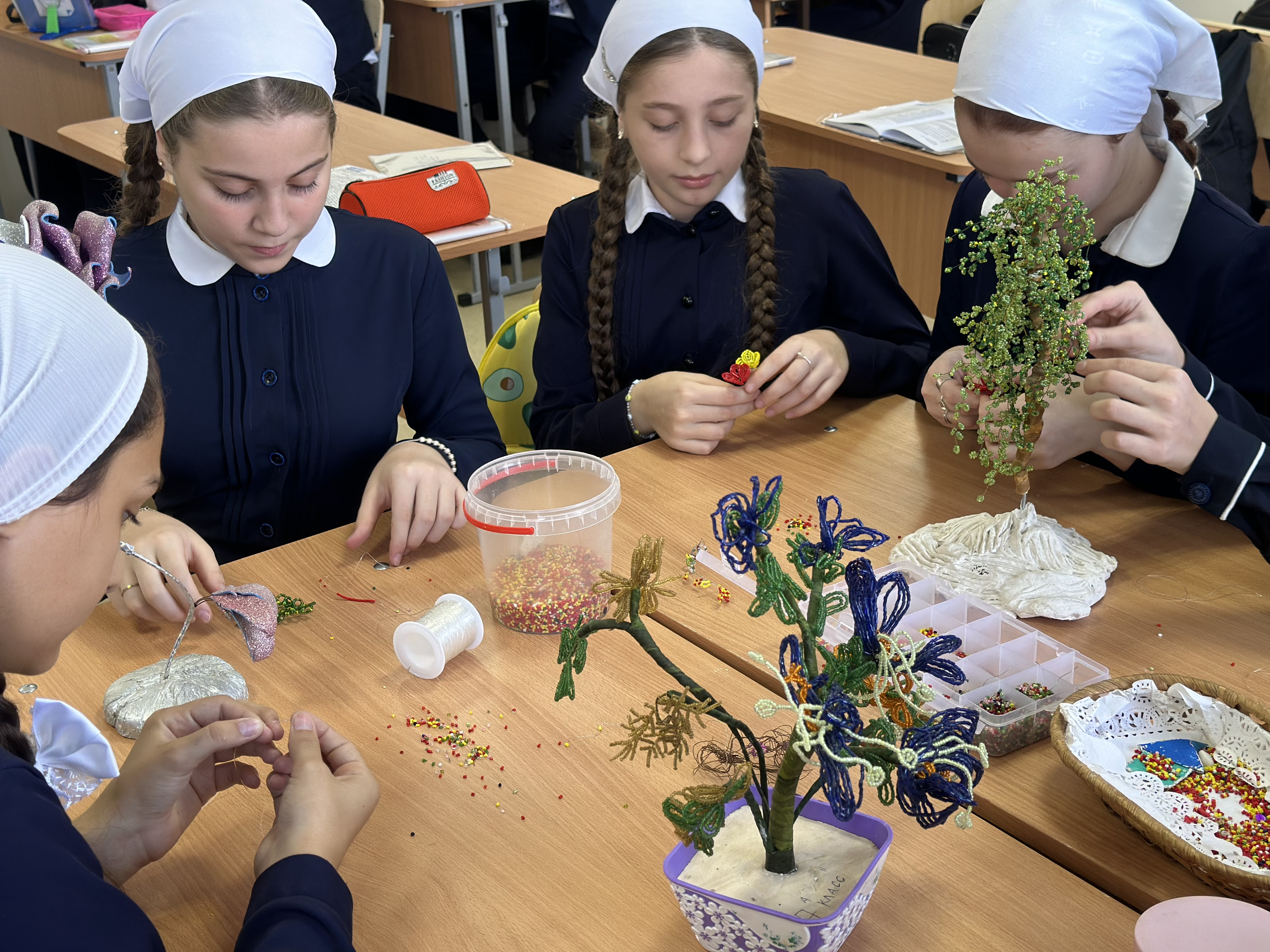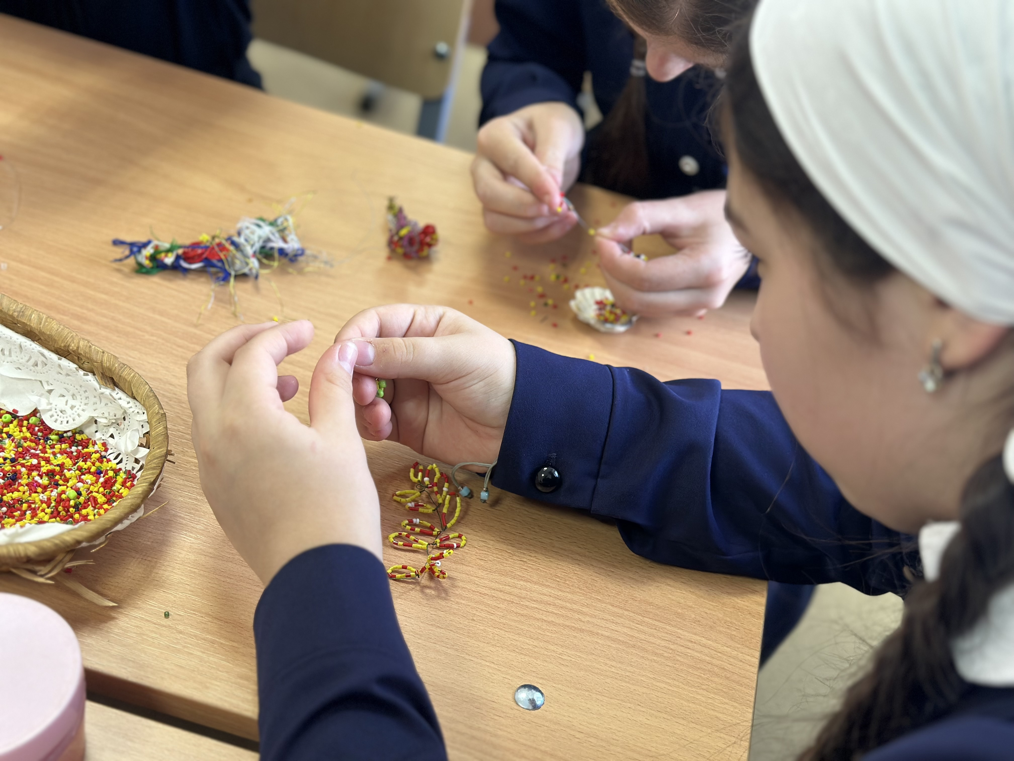 Воспитанники с внимательностью и увлечением послушали историю бисера: когда и где они использовались, из чего делаются и узнали многие другие секреты маленькой бусинки. После небольшой беседы юные участники мероприятия сплели из бисера колечки и браслеты. Каждый подошёл своей работе креативно. Мероприятие прошло в живой и тёплой атмосфере. В последние годы древнее искусство бисероплетения из всех видов народного творчества сегодня у нас, пожалуй, наименее известно. И все же, благодаря истинным приверженцам, оно живет. Украшения, плетенные из бисера, чаще всего использовались в народном костюме, но сейчас его применения в изделиях гораздо больше. Изделия из бисера можно увидеть почти у каждой девочки на руках в виде фенечки с именем или в виде сережки. Особенно бисером вышивают одежду и с ними вещи смотрятся куда наряднее и изысканнее. Сейчас изделия из бисера служат лишь как украшения. Бисероплетение – популярнейший вид рукоделия, который переживал уже не один виток популярности. Сегодня это востребованное творчество, увлекающее детей и взрослых, людей с художественным образованием и тех, кто далек от декоративно-прикладного искусства. «В наше время бусы, браслеты и другие украшения из бисера зачастую считают забавой для детей, не ведая, какие шедевры на самом деле скрываются за маленькими скрывающимися шариками. Эти шарики на самом деле имеют многовековую историю. Они украшали роскошные одежды королей, императоров, царей, фараонов, знатных людей и жрецов.К огромному сожалению, меняется время, приоритеты и вкусы, а вместе с этим и мода»- делится директор школы Альбина Башировна Сардалова.