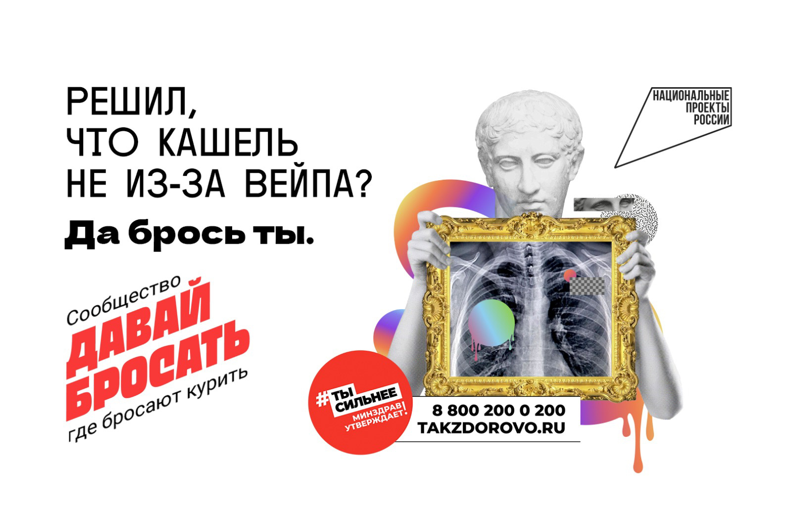 с Минздравом России запустило коммуникационную кампанию «Электронные сигареты и что они скрывают». Рекламные баннеры побуждают людей задуматься, так ли безопасны электронные сигареты для здоровья и какие последствия для организма может спровоцировать курение. Решил, что кашель не из-за вейпа? Считаешь, что курение электронных сигарет не вредно и это просто «клубничный пар»? Да брось ты.