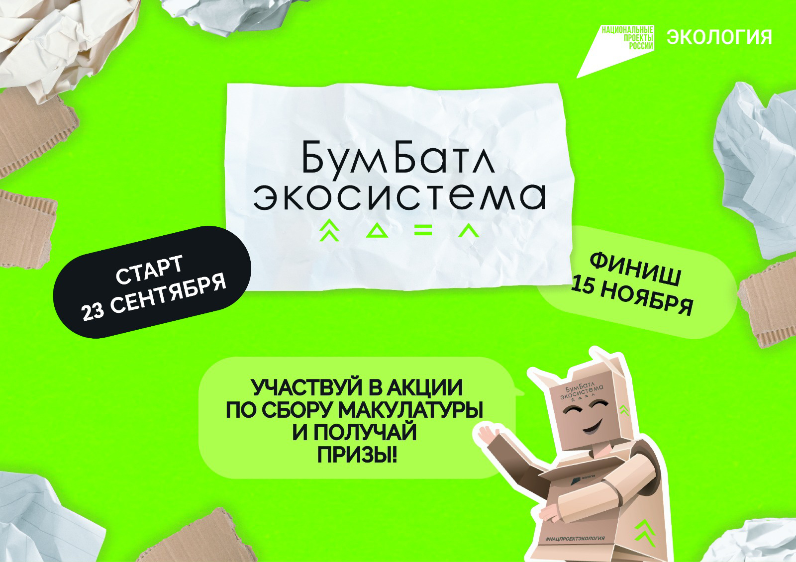 Всероссийская акция по сбору макулатуры «БумБатл» пятый год подряд проходит в поддержку национального проекта «Экология». С 2023 года соорганизатором проекта выступает Всероссийское общественное экологическое движение «Экосистема». За все время проведения «БумБатла» в нем приняли участие более 5,9 миллионов человек, которые собрали более 161 тыс. тонн макулатуры.