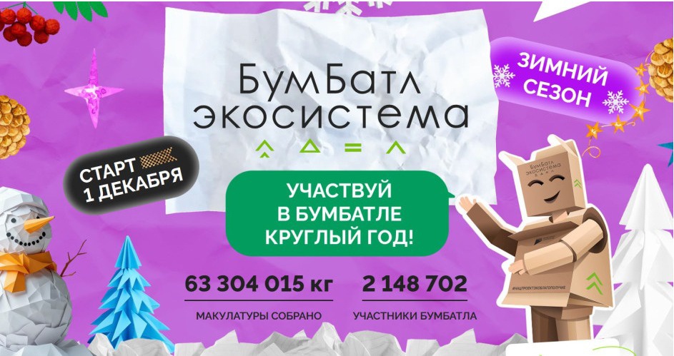 «Зима в «БумБатле» – это не просто сезон, а настоящий вызов для героев экологии! С 1 декабря собирайте макулатуру, создавайте эко-игрушки и ведите свою команду к вершинам – ведь каждый килограмм приближает нас к чистой планете, а ваши усилия вдохновят других участников акции», - сказал сопредседатель Движения «Экосистема» Андрей Руднев.