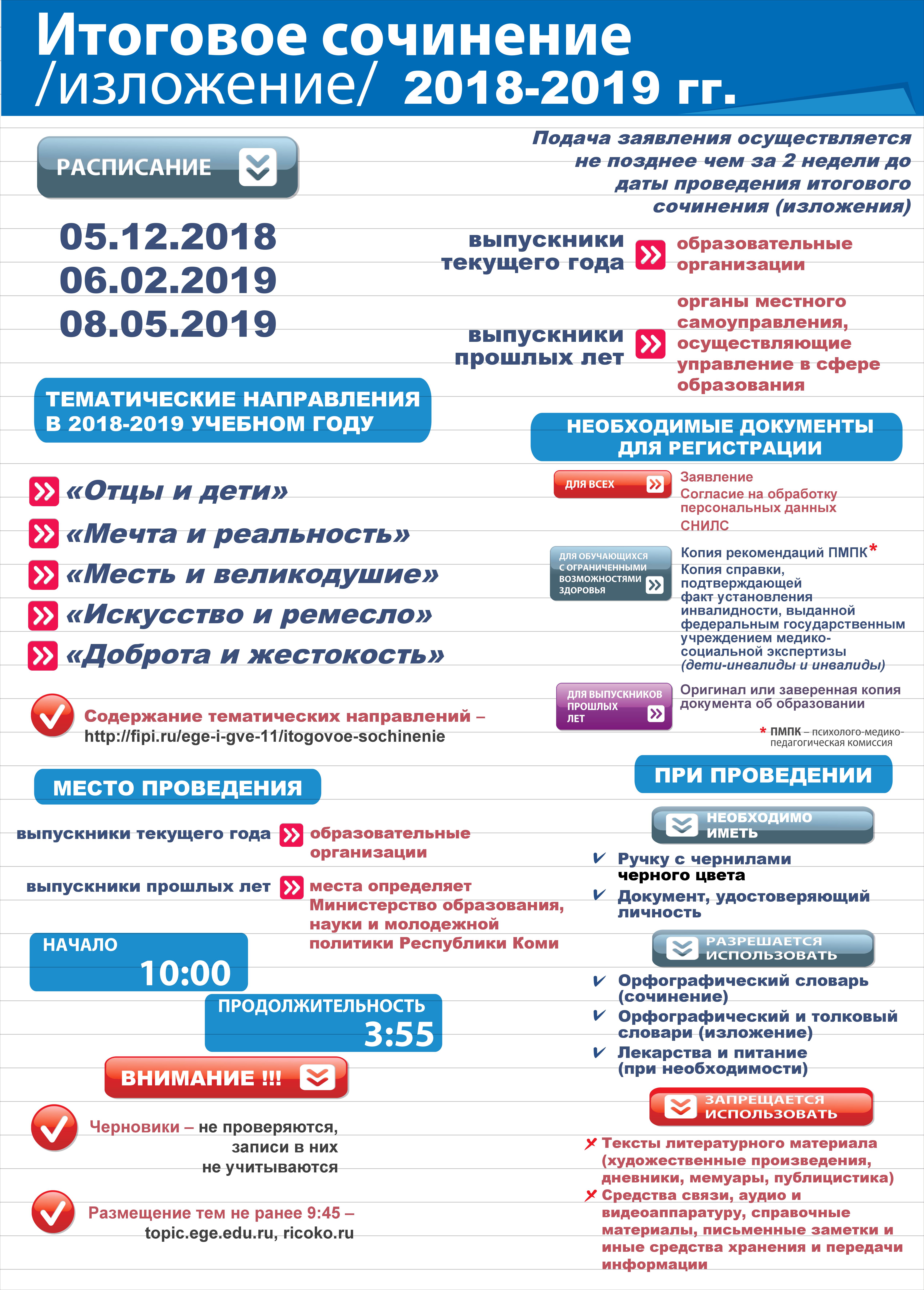 ● Темы сочинений объявят выпускникам в день написания сочинения в 9.45 (за 15 минут до начала работы). В это же время темы будут опубликованы на открытых информационных ресурсах (ege.edu.ru, fipi.ru).