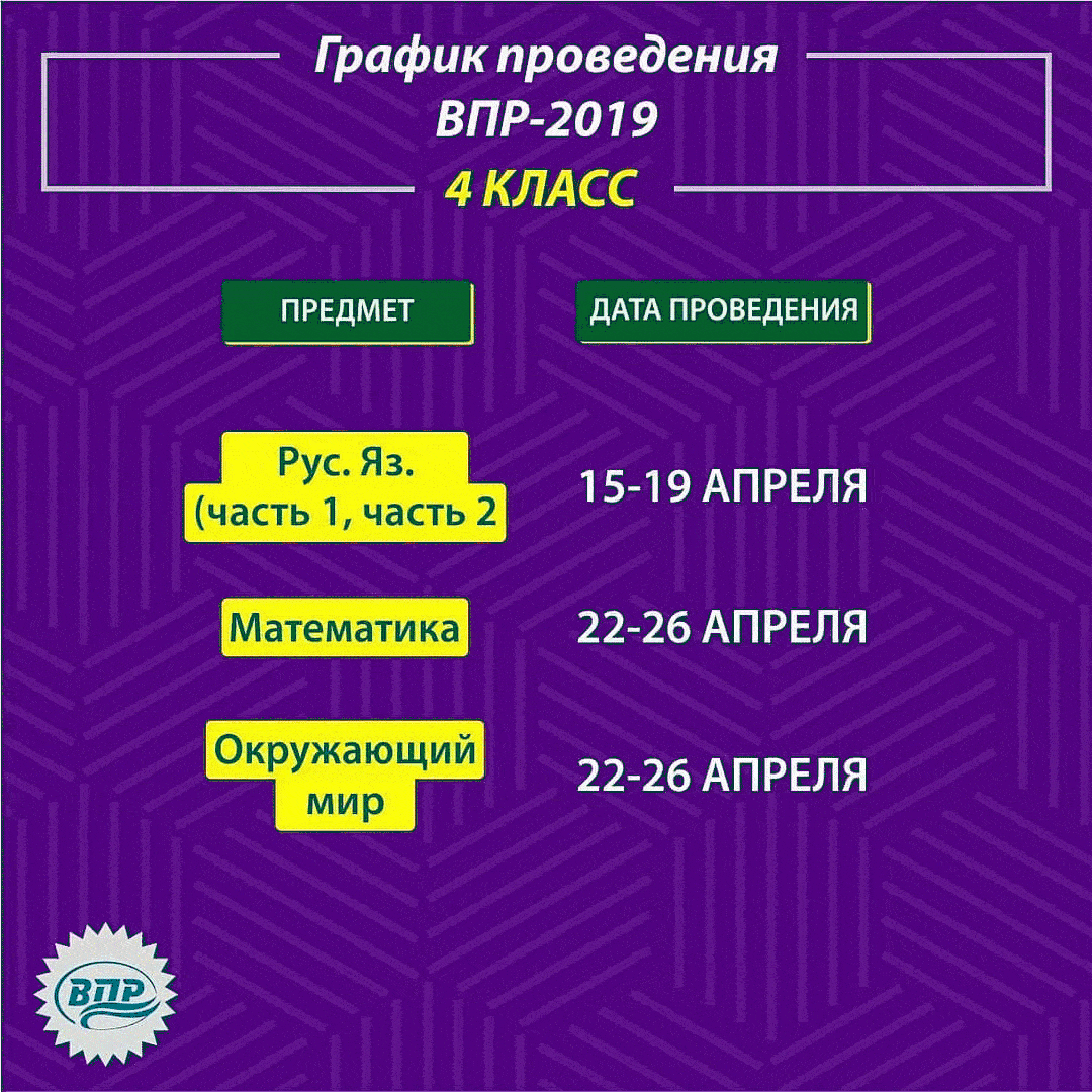 Уважаемые коллеги! Представляем вашему вниманию расписание проведения Всероссийских проверочных работ в 2019 году